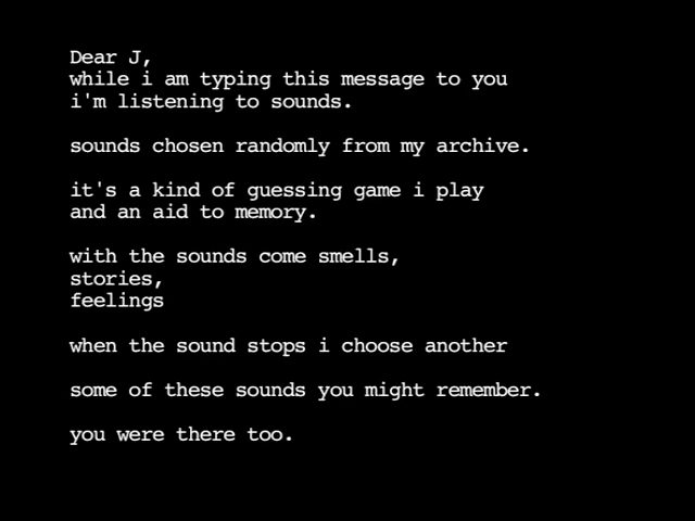 Le film commence par un paysage sonore nocturne accompagné d’un texte sous la forme d’une lettre adressée à J. Le texte apparaît lettre après lettre et transforme l’écran en surface de dialogue entre le réalisateur-machine et le desti- nataire-spectateur «Do you remember? You were there too.» Le film est une expérience de ressouvenirs à partir de bribes sonores et de mots écrits pour amener le spectateur-auditeur-lecteur à produire lui-même les images mentales de son film.